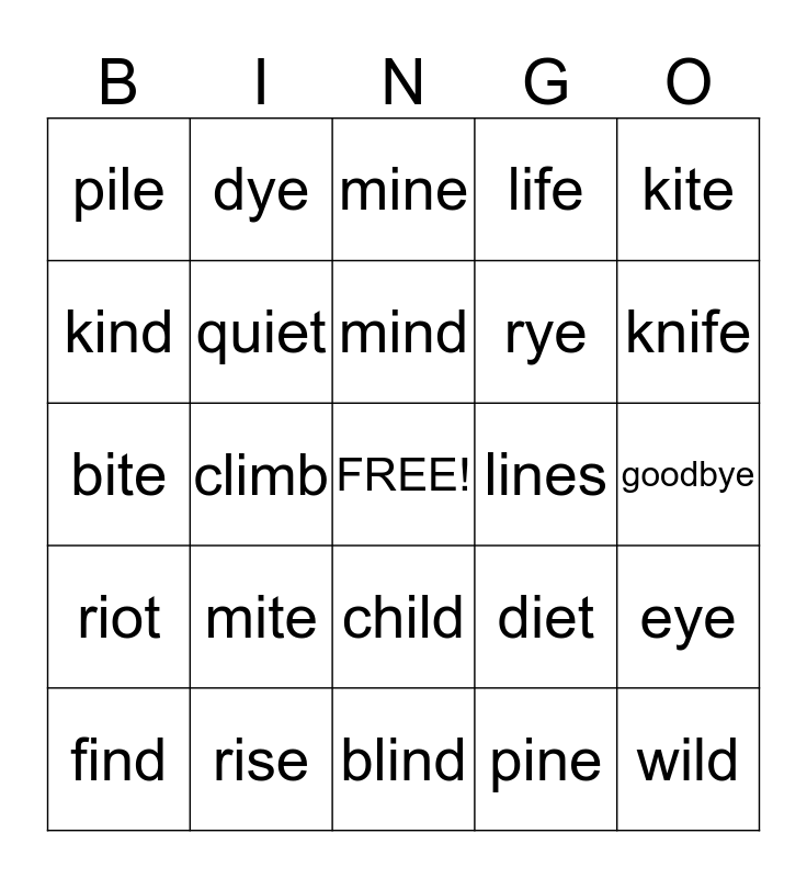 This bingo card has a free space and 24 words: mite, rise, mind, find, kite, pile, kind, dye, lines, child, rye, bite, diet, eye, quiet, pine, goodbye, mine, knife, climb, wild, riot, life and blind.