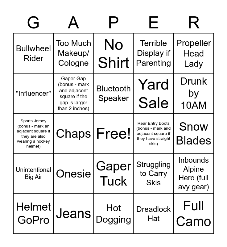 This bingo card has a free space and 24 words: Onesie, Jeans, Bluetooth Speaker, Helmet GoPro, Propeller Head Lady, Bullwheel Rider, "Influencer", Too Much Makeup/ Cologne, Rear Entry Boots (bonus - mark and adjacent square if they have straight skis), Gaper Tuck, Yard Sale, Sports Jersey (bonus - mark an adjacent square if they are also wearing a hockey helmet), Struggling to Carry Skis, Inbounds Alpine Hero (full avy gear), Gaper Gap (bonus - mark and adjacent square if the gap is larger than 2 inches), Dreadlock Hat, Snow Blades, No Shirt, Drunk by 10AM, Chaps, Full Camo, Unintentional Big Air, Terrible Display if Parenting and Hot Dogging.