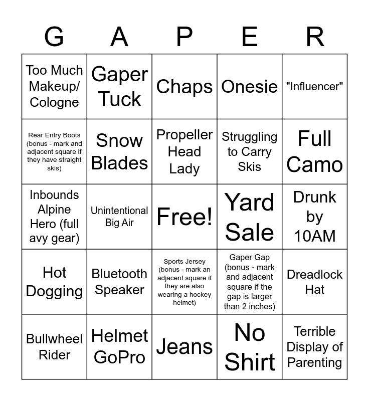 This bingo card has a free space and 24 words: Bluetooth Speaker, Helmet GoPro, Propeller Head Lady, Bullwheel Rider, "Influencer", Too Much Makeup/ Cologne, Rear Entry Boots (bonus - mark and adjacent square if they have straight skis), Gaper Tuck, Yard Sale, Sports Jersey (bonus - mark an adjacent square if they are also wearing a hockey helmet), Struggling to Carry Skis, Inbounds Alpine Hero (full avy gear), Gaper Gap (bonus - mark and adjacent square if the gap is larger than 2 inches), Dreadlock Hat, Snow Blades, No Shirt, Drunk by 10AM, Chaps, Full Camo, Unintentional Big Air, Terrible Display of Parenting, Hot Dogging, Onesie and Jeans.