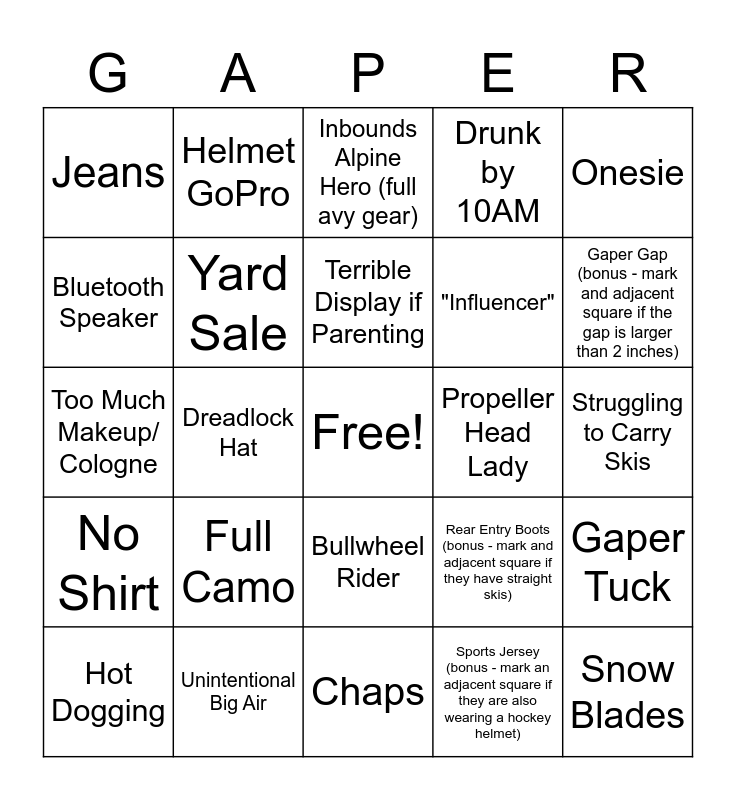 This bingo card has a free space and 24 words: Full Camo, Unintentional Big Air, Terrible Display if Parenting, Hot Dogging, Onesie, Jeans, Bluetooth Speaker, Helmet GoPro, Propeller Head Lady, Bullwheel Rider, "Influencer", Too Much Makeup/ Cologne, Rear Entry Boots (bonus - mark and adjacent square if they have straight skis), Gaper Tuck, Yard Sale, Sports Jersey (bonus - mark an adjacent square if they are also wearing a hockey helmet), Struggling to Carry Skis, Inbounds Alpine Hero (full avy gear), Gaper Gap (bonus - mark and adjacent square if the gap is larger than 2 inches), Dreadlock Hat, Snow Blades, No Shirt, Drunk by 10AM and Chaps.