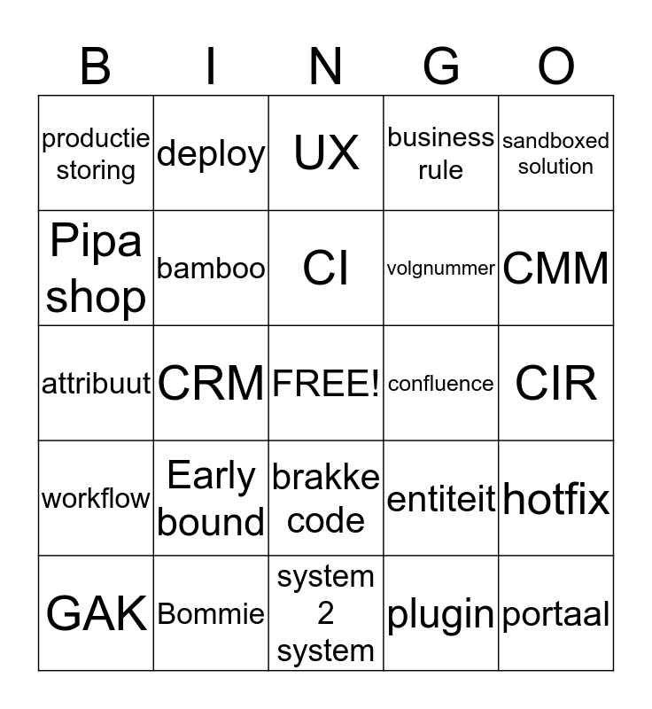 This bingo card has a free space and 25 words: Early bound, system 2 system, CI, GAK, sandboxed solution, productie storing, Pipa shop, deploy, confluence, brakke code, volgnummer, attribuut, entiteit, hotfix, bamboo, stamdata, CIR, UX, CMM, CRM, portaal, Bommie, workflow, business rule and plugin.