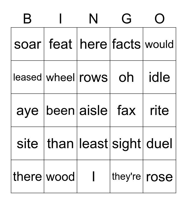 This bingo card has 45 words: isle, aisle, I'll, there, their, they're, here, hear, would, wood, facts, fax, least, than, then, I, eye, aye, idol, idle, feat, feet, sore, soar, write, rite, right, cite, sight, site, dual, duel, patients, patience, bin, been, chews, choose, rose, rows, leased, oh, owe, wheel and we'll.