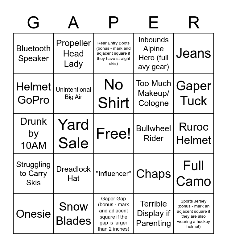 This bingo card has a free space and 24 words: Dreadlock Hat, Snow Blades, No Shirt, Onesie, Jeans, Bluetooth Speaker, Helmet GoPro, Propeller Head Lady, Bullwheel Rider, "Influencer", Too Much Makeup/ Cologne, Drunk by 10AM, Chaps, Full Camo, Unintentional Big Air, Terrible Display if Parenting, Ruroc Helmet, Rear Entry Boots (bonus - mark and adjacent square if they have straight skis), Gaper Tuck, Yard Sale, Sports Jersey (bonus - mark an adjacent square if they are also wearing a hockey helmet), Struggling to Carry Skis, Inbounds Alpine Hero (full avy gear) and Gaper Gap (bonus - mark and adjacent square if the gap is larger than 2 inches).