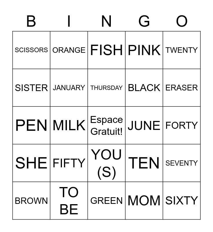 This bingo card has a free space and 71 words: RED, ORANGE, YELLOW, BLUE, GREEN, PURPLE, PINK, GRAY, BLACK, WHITE, BROWN, PENCIL, ERASER, SCISSORS, BINDER, PEN, TEN, TWENTY, THIRTY, FORTY, FIFTY, SIXTY, SEVENTY, EIGHTY, NINETY, ONE HUNDRED, FRENCH, ENGLISH, TO DO, TO HAVE, TO BE, TO GO, TO WANT, TO SEE, MOM, DAD, FAMILY, BROTHER, SISTER, I, YOU (S), HE, SHE, WE, YOU (P), THEY (M), THEY (F), JANUARY, FEBRUARY, MARCH, APRIL, MAY, JUNE, MONDAY, TUESDAY, WEDNESDAY, THURSDAY, FRIDAY, CHEESE, CHICKEN, BANANA, APPLE, MILK, WATER, PICKLE, EGG, FISH, WINTER, SPRING, SUMMER and AUTUMN.