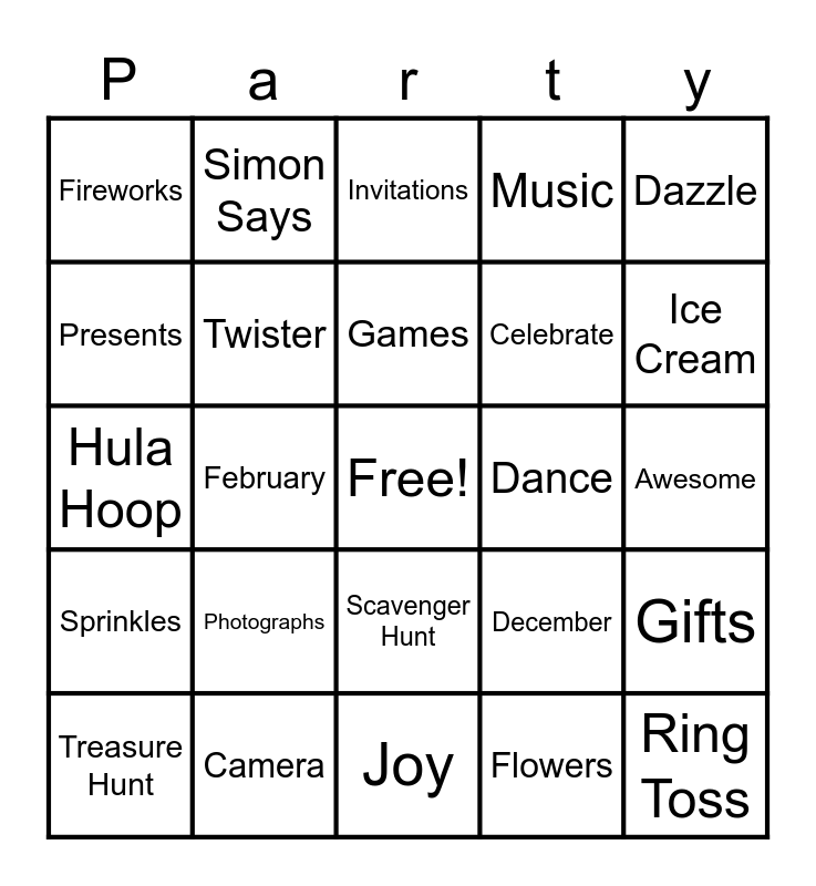 This bingo card has a free space and 100 words: April, August, Awesome, Balloons, Banner, Bean Bag Toss, Best Wishes, Beautiful, Birthday Cake, Blindman Bluff, Blue Grass Music, Bowling, Bubble Gum, Camera, Candles, Candy, Celebrate, Champagne, Chips, Clowns, Cocktails, Cookies, Crafts, Cupcakes, Cups, Dance, Dazzle, December, Disco Ball, Dress Up Clothes, February, Fireworks, Flashy, Friends, Flowers, Games, Gifts, Giftwrap, Guests, Happy Day, Hayride, Hokey Pokey, Hula Hoop, Horns, Ice Cream, Invitations, January, July, June, Joy, Laughter, Lemonade, Life, Love, March, Magician, May, Mid-life, Movies, Music, Musical Chairs, Napkins, November, Obstacle Course, October, Old, Over-the-Hill, Paper Lanterns, Parade, Party Favors, Party Hats, Photographs, Ping Pong, Pink Frosting, Piñata, Plates, Pony Rides, Presents, Pretzels, Relay Races, Ribbon, Ring Toss, Rock and Roll, Scavenger Hunt, September, Simon Says, Sparklers, Special, Spoon Race, Sprinkles, Soda, Stories, Streamers, Treasure Hunt, Twister, Vanilla Icing, Whistles, Wine, Wise and Young.
