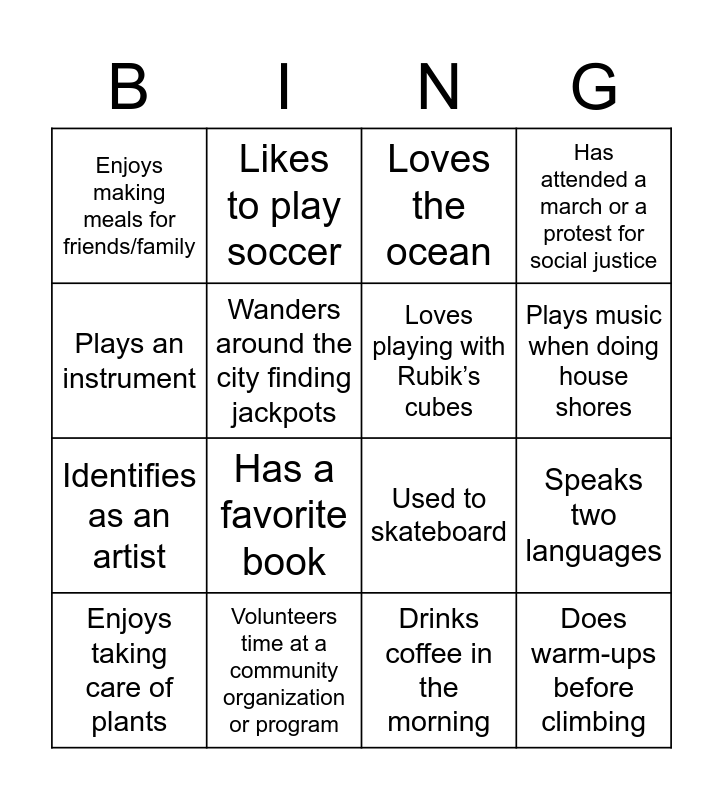 This bingo card has 20 words: Speaks two languages, Enjoys going on hikes, Loves the ocean, Speaks the same language as you, Enjoys taking care of plants, Plays an instrument, Volunteers time at a community organization or program, Enjoys making meals for friends/family, Identifies as an artist, Likes to play soccer, Has a favorite book, Used to skateboard, Wanders around the city finding jackpots, Does warm-ups before climbing, Loves playing with Rubik’s cubes, Is climbing for the first or second time, Plays music when doing house shores, Has attended a march or a protest for social justice, Drinks coffee in the morning and Has a pet they love lots.