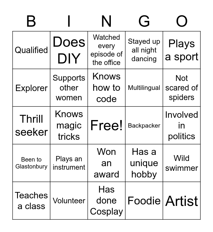 This bingo card has a free space and 24 words: Plays an instrument, Volunteer, Knows how to code, Teaches a class, Plays a sport, Qualified, Explorer, Does DIY, Backpacker, Won an award, Multilingual, Thrill seeker, Has a unique hobby, Wild swimmer, Supports other women, Foodie, Involved in politics, Watched every episode of the office, Not scared of spiders, Knows magic tricks, Artist, Been to Glastonbury, Stayed up all night dancing and Has done Cosplay.