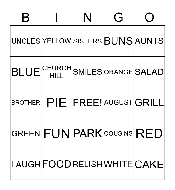 This bingo card has a free space and 24 words: FUN, FOOD, SMILES, LAUGH, AUNTS, UNCLES, BLUE, YELLOW, AUGUST, PARK, ORANGE, BROTHER, COUSINS, RED, CHURCH HILL, WHITE, GRILL, SISTERS, SALAD, PIE, CAKE, GREEN, BUNS and RELISH.