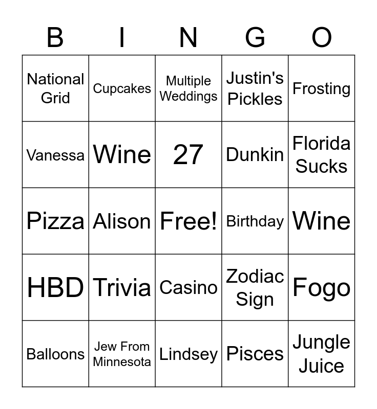 This bingo card has a free space and 24 words: Trivia, Jew From Minnesota, 27, Balloons, Frosting, National Grid, Vanessa, Cupcakes, Birthday, Casino, Dunkin, Pizza, Zodiac Sign, Fogo, Wine, Pisces, Wine, Multiple Weddings, Florida Sucks, Alison, Jungle Juice, HBD, Justin's Pickles and Lindsey.