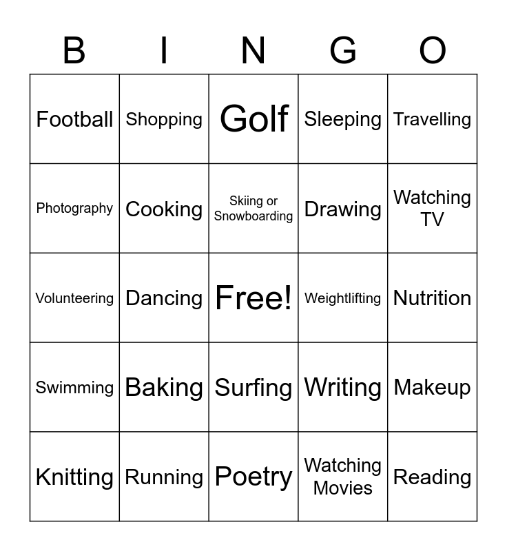 This bingo card has a free space and 29 words: Knitting, Singing, Dancing, Music, Football, Golf, Cooking, Baking, Weightlifting, Running, Nutrition, Reading, Poetry, Watching Movies, Watching TV, Meditation, Surfing, Swimming, Travelling, Volunteering, Writing, Painting, Drawing, Photography, Sleeping, Shopping, Makeup, Skiing or Snowboarding and Working.