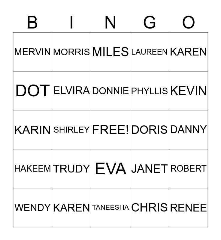 This bingo card has a free space and 24 words: TRUDY, KAREN, DONNIE, WENDY, KAREN, MERVIN, DOT, MORRIS, DORIS, EVA, PHYLLIS, KARIN, JANET, ROBERT, ELVIRA, CHRIS, DANNY, MILES, KEVIN, SHIRLEY, RENEE, HAKEEM, LAUREEN and TANEESHA.