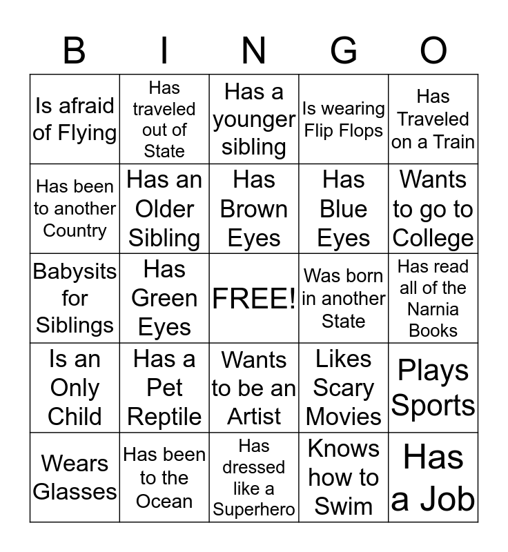 This bingo card has a free space and 24 words: Has a Pet Reptile, Has been to the Ocean, Has Brown Eyes, Wears Glasses, Has Traveled on a Train, Is afraid of Flying, Has been to another Country, Has traveled out of State, Was born in another State, Wants to be an Artist, Has Blue Eyes, Babysits for Siblings, Likes Scary Movies, Plays Sports, Has an Older Sibling, Knows how to Swim, Has read all of the Narnia Books, Has a younger sibling, Wants to go to College, Has Green Eyes, Has a Job, Is an Only Child, Is wearing Flip Flops and Has dressed like a Superhero.