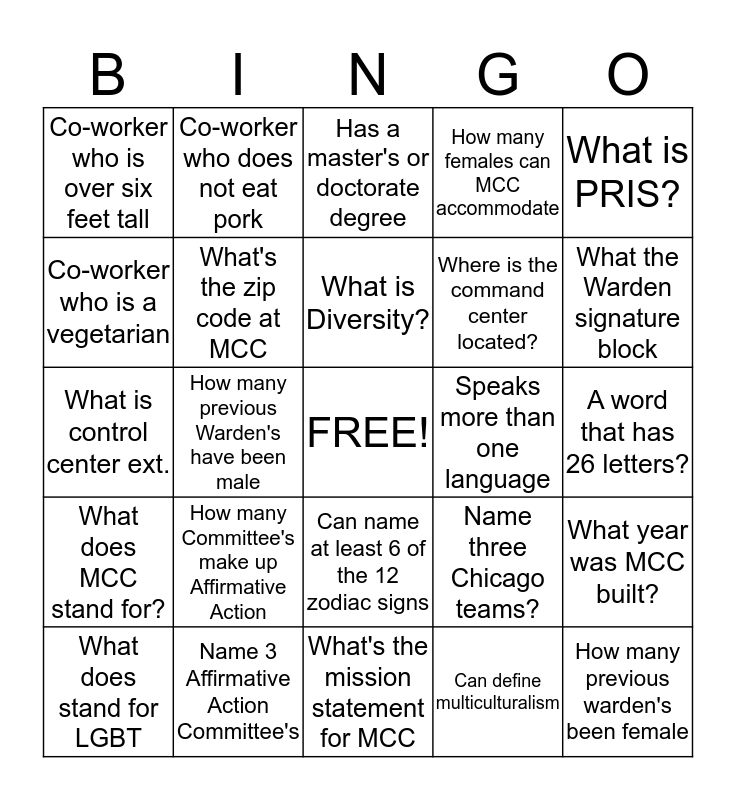 This bingo card has a free space and 24 words: How many Committee's make up Affirmative Action, Name 3 Affirmative Action Committee's, What is Diversity?, What does stand for LGBT, What is PRIS?, Co-worker who is over six feet tall, Co-worker who is a vegetarian, Co-worker who does not eat pork, Speaks more than one language, Can name at least 6 of the 12 zodiac signs, Where is the command center located?, What is control center ext., Name three Chicago teams?, What year was MCC built?, What's the zip code at MCC, Can define multiculturalism, A word that has 26 letters?, Has a master's or doctorate degree, What the Warden signature block, How many previous Warden's have been male, How many previous warden's been female, What does MCC stand for?, How many females can MCC accommodate and What's the mission statement for MCC.