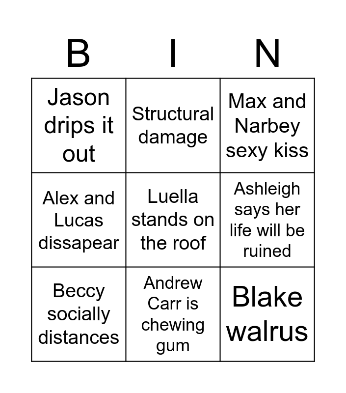This bingo card has 12 words: Jono takes over from Liam on decks, Blake walrus, Luella stands on the roof, Ashleigh says her life will be ruined, Structural damage, Max and Narbey sexy kiss, Andrew Carr is chewing gum, Piper peeps, Jason drips it out, Alex and Lucas dissapear, Beccy socially distances and Girlboss joke initiated.