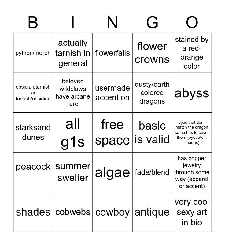 This bingo card has a free space and 24 words: summer swelter, cobwebs, usermade accent on, shades, stained by a red-orange color, python/morph, obsidian/tarnish or tarnish/obsidian, actually tarnish in general, basic is valid, algae, dusty/earth colored dragons, starksand dunes, fade/blend, has copper jewelry through some way (apparel or accent), beloved wildclaws have arcane rare, antique, eyes that don't match the dragon so he has to cover them (eyepatch, shades), flowerfalls, abyss, all g1s, very cool sexy art in bio, peacock, flower crowns and cowboy.