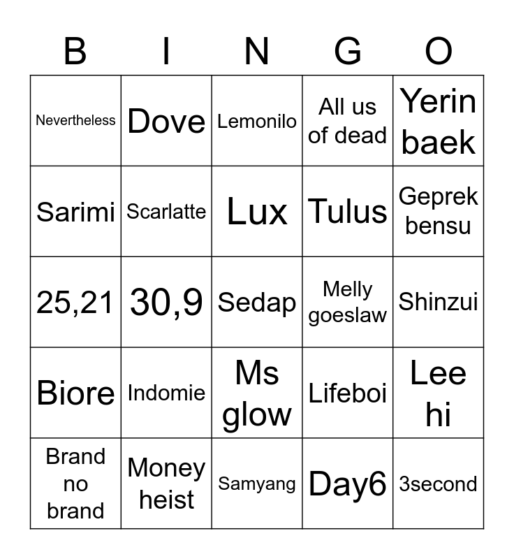 This bingo card has a free space and 24 words: Indomie, Money heist, Lux, Brand no brand, Yerin baek, Nevertheless, Sarimi, Dove, Melly goeslaw, Ms glow, Tulus, 25,21, Lifeboi, Lee hi, Scarlatte, Day6, Shinzui, Lemonilo, Geprek bensu, 30,9, 3second, Biore, All us of dead and Samyang.