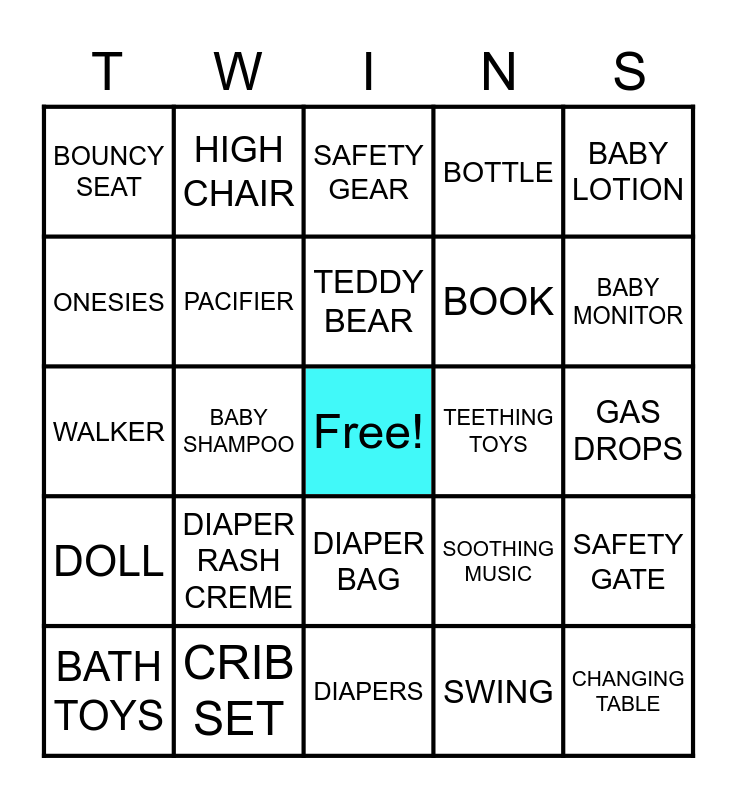This bingo card has a free space and 49 words: CARSEAT, CHANGING TABLE, CRIB, DIAPERS, DIAPER RASH CREME, HAND SANITIZER, HIGH CHAIR, NIGHT LIGHT, ONESIES, BIB, PACIFIER, BOTTLE, SAFETY GATE, SOOTHING MUSIC, THERMOMETER, STROLLER, TEDDY BEAR, TEETHING TOYS, WIPES, BABY LOTION, BABY SHAMPOO, SWING, BOUNCY SEAT, BOOK, BLOCKS, BABY MONITOR, BATH TOYS, RECEIVING BLANKET, DIAPER BAG, DOLL, BOTTLE BRUSH, BOTTLE DRYING RACK, BOTTLE WARMER, FULL OUTFIT, CRIB SET, HANDMADE ITEM, CRIB SHEET, TUMMY TIME, GAS DROPS, GIFT CARD, GROOMING KIT, HAT, SOCKS, WASHCLOTHS, WALKER, SAFETY GEAR, SPOONS, MITTENS and NURSERY RHYMES.