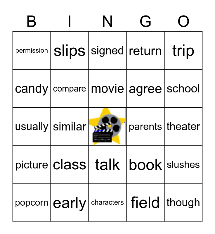 This bingo card has a free space and 24 words: popcorn, class, movie, field, trip, permission, slips, signed, parents, theater, usually, compare, book, slushes, candy, early, characters, return, school, picture, similar, talk, agree and though.
