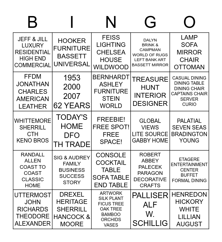 This bingo card has a free space and 24 words: SIG & AUDREY FAMILY BUSINESS SUCCESS STORY, DREXEL HERITAGE SHERRILL HANCOCK & MOORE, BERNHARDT ASHLEY FURNITURE STEIN WORLD, UTTERMOST JOHN RICHARDS THEODORE ALEXANDER, LAMP SOFA MIRROR CHAIR OTTOMAN, JEFF & JILL LUXURY RESIDENTIAL HIGH END COMMERCIAL, FFDM JONATHAN CHARLES AMERICAN LEATHER, HOOKER FURNITURE BASSETT UNIVERSAL, GLOBAL VIEWS LITE SOURCE GABBY HOME, CONSOLE COCKTAIL TABLE SOFA TABLE END TABLE, TREASURE HUNT INTERIOR DESIGNER, WHITTEMORE SHERRILL CTH KENO BROS, ROBERT ABBEY PALECEK PARAGON DECORATIVE CRAFTS, ETAGERE ENTERTAINMENT CENTER BUFFET FORMAL DINING, 1953 2000 2007 62 YEARS, PALLISER ALF W. SCHILLIG, PALATIAL SEVEN SEAS BRADINGTON YOUNG, FEISS LIGHTING CHELSEA HOUSE WILDWOOD, CASUAL DINING DINING TABLE DINING CHAIR CAPTAINS CHAIR SERVER CURIO, TODAY'S HOME DFO TH TRADE, HENREDON HICKORY WHITE LILLIAN AUGUST, RANDALL ALLEN COAST TO COAST CLASSIC HOME, DALYN BRINK & CAMPMAN WORLD OF RUGS LEFT BANK ART BASSETT MIRROR and ARTWORK SILK PLANT FICUS TREE OAK TREE BAMBOO ORCHIDS VASES.