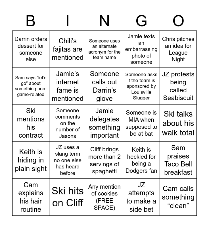 This bingo card has 25 words: Keith is hiding in plain sight, Ski hits on Cliff, Jamie delegates something important, JZ attempts to make a side bet, Chris pitches an idea for League Night, Darrin orders dessert for someone else, Chili’s fajitas are mentioned, Someone uses an alternate acronym for the team name, Someone is MIA when supposed to be at bat, Sam praises Taco Bell breakfast, Sam says “let’s go” about something non-game-related, Jamie’s internet fame is mentioned, Any mention of cookies (FREE SPACE), Keith is heckled for being a Dodgers fan, JZ protests being called Seabiscuit, Cam explains his hair routine, Someone comments on the number of Jasons, Someone calls out Darrin’s glove, Someone asks if the team is sponsored by Louisville Slugger, Ski talks about his walk total, Ski mentions his contract, JZ uses a slang term no one else has heard before, Cliff brings more than 2 servings of spaghetti, Jamie texts an embarrassing photo of someone and Cam calls something “clean”.