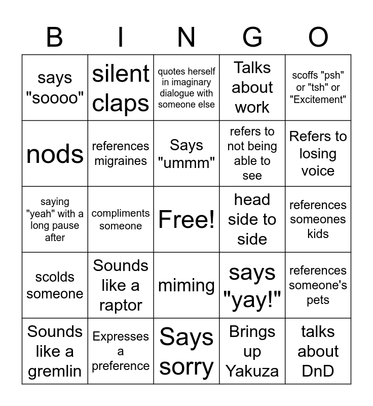 This bingo card has a free space and 24 words: Sounds like a raptor, Expresses a preference, Says "ummm", Sounds like a gremlin, scoffs "psh" or "tsh" or "Excitement", says "soooo", nods, silent claps, head side to side, miming, refers to not being able to see, saying "yeah" with a long pause after, says "yay!", references someone's pets, references migraines, Brings up Yakuza, references someones kids, quotes herself in imaginary dialogue with someone else, Refers to losing voice, compliments someone, talks about DnD, scolds someone, Talks about work and Says sorry.