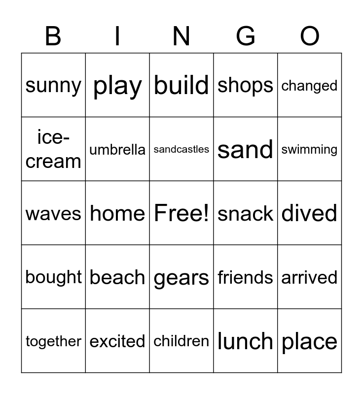 This bingo card has a free space and 24 words: beach, excited, sandcastles, together, changed, sunny, ice-cream, play, snack, gears, sand, waves, friends, arrived, umbrella, lunch, dived, build, swimming, home, place, bought, shops and children.