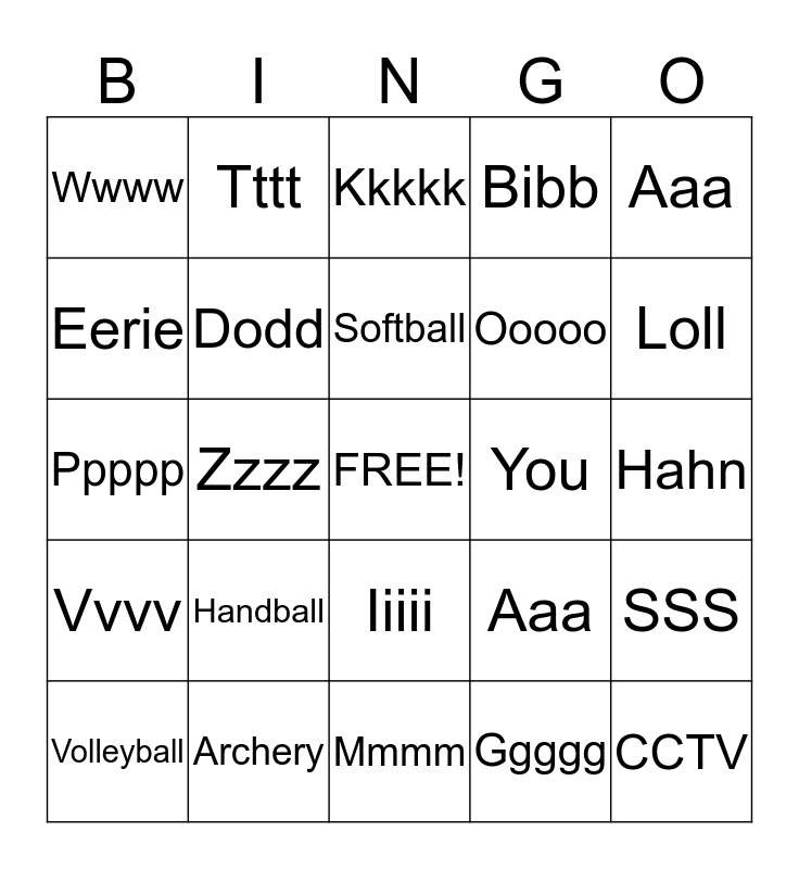 This bingo card has a free space and 24 words: Handball, Archery, Softball, Volleyball, Aaa, Wwww, Eerie, Tttt, You, Iiiii, Ooooo, Ppppp, Aaa, SSS, Dodd, Ggggg, Hahn, Kkkkk, Loll, Zzzz, CCTV, Vvvv, Bibb and Mmmm.