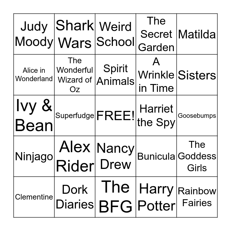 This bingo card has a free space and 61 words: Warriors, Dork Diaries, Star Wars Academy, Ninjago, Harry Potter, Babymouse, The Wonderful Wizard of Oz, Pinnochio, A Wrinkle in Time, Big Nate, The Secret Garden, Charlie & the Chocolate Factory, Alice in Wonderland, Tuck Everlasting, Percy Jackson & the Olympians, Judy Moody, Rainbow Fairies, Matilda, The Series of Unfortunate Events, Spirit Animals, Harriet the Spy, Weird School, Clementine, The Goddess Girls, Ramona the Pest, The Hardy Boys, Little House on the Prairie, Wayside School is Falling Down, Sisters, 39 Clues, Henry Huggins, Pokemon, Lunch Lady, Because of Winn Dixie, Shark Wars, Junie B. Jones, How to Train Your Dragon, Superfudge, Jigsaw Jones, Ivy & Bean, A to Z Mysteries, Alex Rider, Goosebumps, Horrible Harry, Bunicula, The Magic Tree House, Geronimo Stilton, A Little Princess, American Girls, Nancy Drew, The BFG, Bad Kitty, The Lion, the Witch and the Wardrobe, The Bridge to Terabithia, Wonderstruck, The Diary of a Wimpy Kid, Septimus Heap, Cam Jansen, Peter Pan, Charlotte's Web and The Cupcake Diaries.