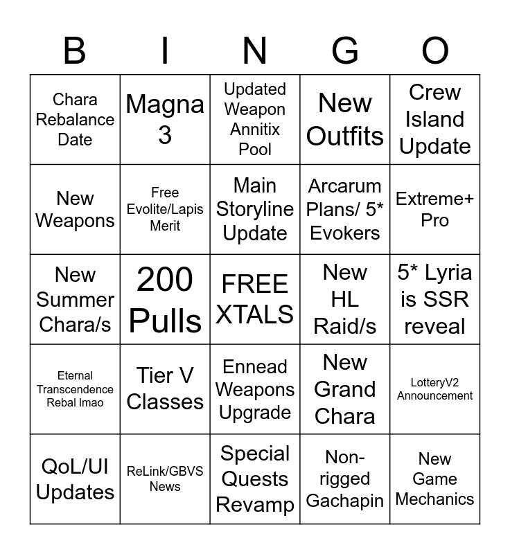 This bingo card has a free space and 24 words: Tier V Classes, ReLink/GBVS News, Main Storyline Update, QoL/UI Updates, Crew Island Update, Chara Rebalance Date, New Weapons, Magna 3, New HL Raid/s, Ennead Weapons Upgrade, Arcarum Plans/ 5* Evokers, New Summer Chara/s, New Grand Chara, LotteryV2 Announcement, Free Evolite/Lapis Merit, Non-rigged Gachapin, 5* Lyria is SSR reveal, Updated Weapon Annitix Pool, Extreme+ Pro, 200 Pulls, New Game Mechanics, Eternal Transcendence Rebal lmao, New Outfits and Special Quests Revamp.