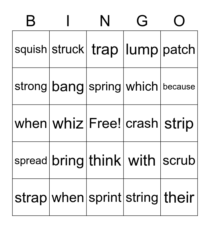 This bingo card has a free space and 28 words: scrub, chin, which, string, strong, trap, struck, spread, crash, strap, when, lump, when, sprint, because, squid, bring, bang, spring, think, squish, catch, their, whiz, strip, with, patch and split.