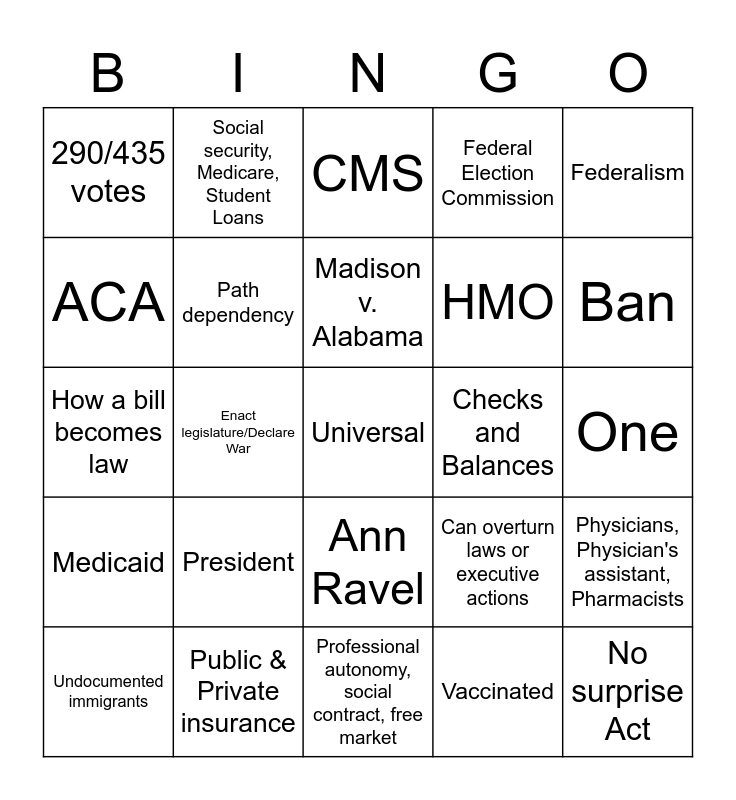 This bingo card has 27 words: Can overturn laws or executive actions, No surprise Act, HMO, Professional autonomy, social contract, free market, ACA, CMS, Social security, Medicare, Student Loans, Medicaid, Checks and Balances, Physicians, Physician's assistant, Pharmacists, How a bill becomes law, Federal Election Commission, Undocumented immigrants, Public & Private insurance, Ban, Culture, Path dependency, Madison v. Alabama, President, 290/435 votes, One, Vaccinated, Enact legislature/Declare War, Universal, Ann Ravel, Federalism and Citizens United.