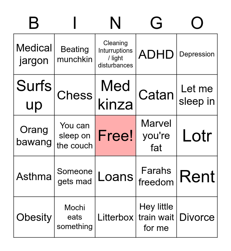 This bingo card has a free space and 24 words: Someone gets mad, Mochi eats something, Med kinza, Obesity, Depression, Medical jargon, Surfs up, Beating munchkin, Marvel you're fat, Loans, Catan, Orang bawang, Farahs freedom, Rent, Chess, Hey little train wait for me, Lotr, Cleaning Inturruptions / light disturbances, Let me sleep in, You can sleep on the couch, Divorce, Asthma, ADHD and Litterbox.