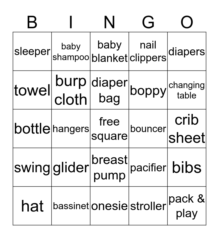 This bingo card has a free space and 24 words: glider, bassinet, diaper bag, hat, diapers, sleeper, towel, baby shampoo, bouncer, breast pump, boppy, bottle, pacifier, bibs, burp cloth, stroller, crib sheet, baby blanket, changing table, hangers, pack & play, swing, nail clippers and onesie.