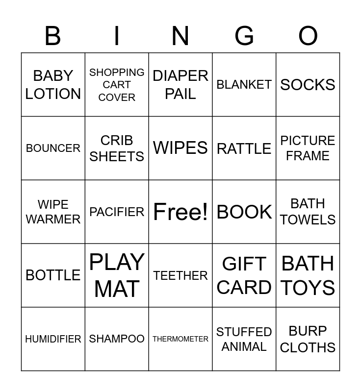 This bingo card has a free space and 40 words: ONESIE, WIPE WARMER, PLAYPEN, CRIB SHEETS, SHAMPOO, TEETHER, WIPES, SWADDLE, SOCKS, BOTTLE, PACIFIER, BLANKET, BURP CLOTHS, BATH TOWELS, BOOK, PLAY MAT, CHANGING PAD, BABY LOTION, BIB, DIAPER PAIL, BATH TOYS, STUFFED ANIMAL, RATTLE, BOUNCER, NIGHT LIGHT, CRIB, HAT, SPOON, MITTENS, SIPPY CUP, HIGH CHAIR, HUMIDIFIER, DIAPERS, GIFT CARD, PICTURE FRAME, THERMOMETER, STROLLER FAN, NOISE MACHINE, SHOPPING CART COVER and BABY WRAP CARRIER.