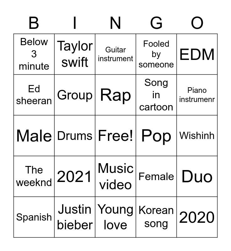 This bingo card has a free space and 24 words: 2021, Justin bieber, Rap, Spanish, EDM, Below 3 minute, Ed sheeran, Taylor swift, Pop, Music video, Song in cartoon, Male, Female, Duo, Group, Korean song, Wishinh, Guitar instrument, Piano instrumenr, Drums, 2020, The weeknd, Fooled by someone and Young love.