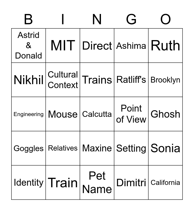 This bingo card has 35 words: Gogol, Walkers, Ashoke, Cultural Context, Maxine, Ashima, Nikhil, Nikolai Gogol, Trains, Italy, Engineering, Ruth, Realistic, Paris, Astrid & Donald, Point of View, Dimitri, Mouse, Goggles, Calcutta, Setting, Identity, Sonia, Train, Direct, Brooklyn, California, Ganguli, Ratliff's, Ghosh, Mazoomdar, Pet Name, Relatives, MIT and Doctorate.