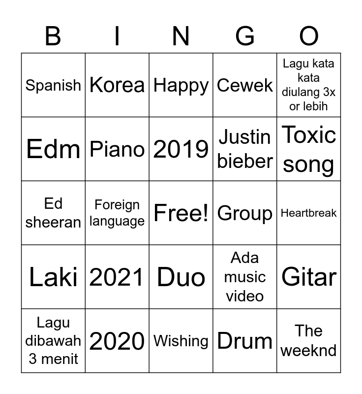 This bingo card has a free space and 24 words: 2021, 2020, 2019, Lagu dibawah 3 menit, Lagu kata kata diulang 3x or lebih, Spanish, Edm, Korea, Group, Duo, Justin bieber, Ed sheeran, Ada music video, Gitar, Piano, Drum, Heartbreak, Happy, Toxic song, Foreign language, The weeknd, Laki, Cewek and Wishing.