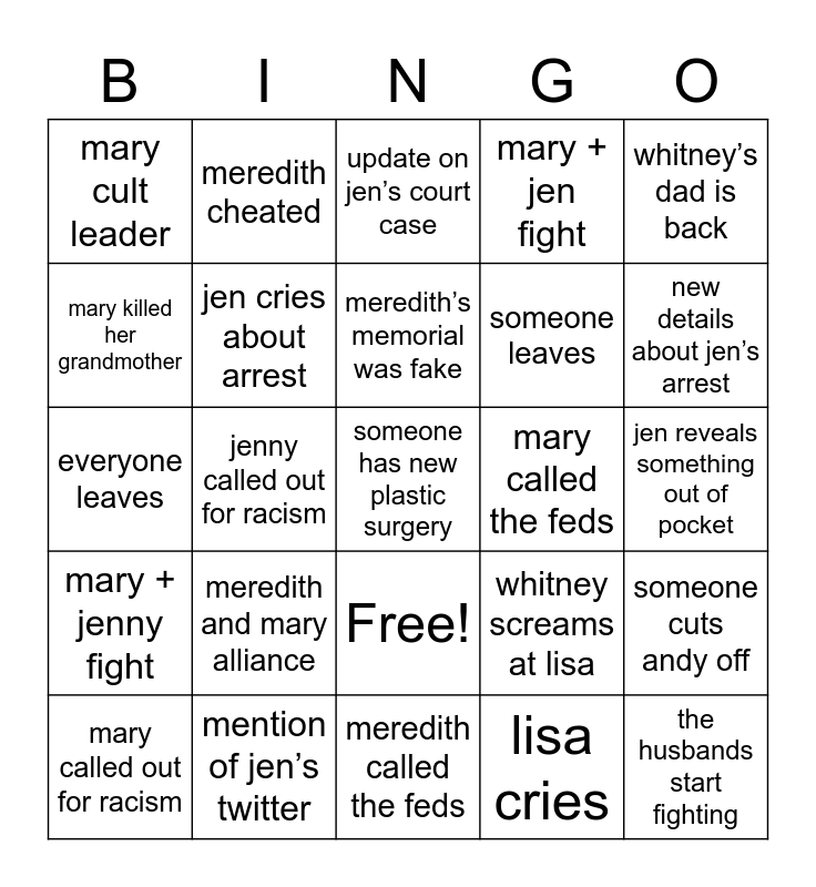 This bingo card has 26 words: Free!, lisa cries, meredith’s memorial was fake, mention of jen’s twitter, whitney’s dad is back, mary cult leader, mary killed her grandmother, meredith cheated, jen reveals something out of pocket, whitney screams at lisa, someone leaves, everyone leaves, someone cuts andy off, mary called out for racism, jenny called out for racism, heather cries about being a bad mormon, mary + jen fight, mary + jenny fight, update on jen’s court case, someone has new plastic surgery, new details about jen’s arrest, meredith called the feds, mary called the feds, meredith and mary alliance, jen cries about arrest and the husbands start fighting.