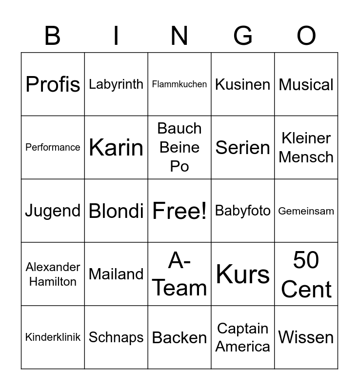 This bingo card has a free space and 25 words: Mailand, Backen, Bauch Beine Po, Kinderklinik, Musical, Profis, Performance, Labyrinth, Babyfoto, A-Team, Serien, Jugend, Kurs, 50 Cent, Karin, Hauptrolle, Gemeinsam, Flammkuchen, Kleiner Mensch, Blondi, Wissen, Schnaps, Alexander Hamilton, Kusinen and Captain America.