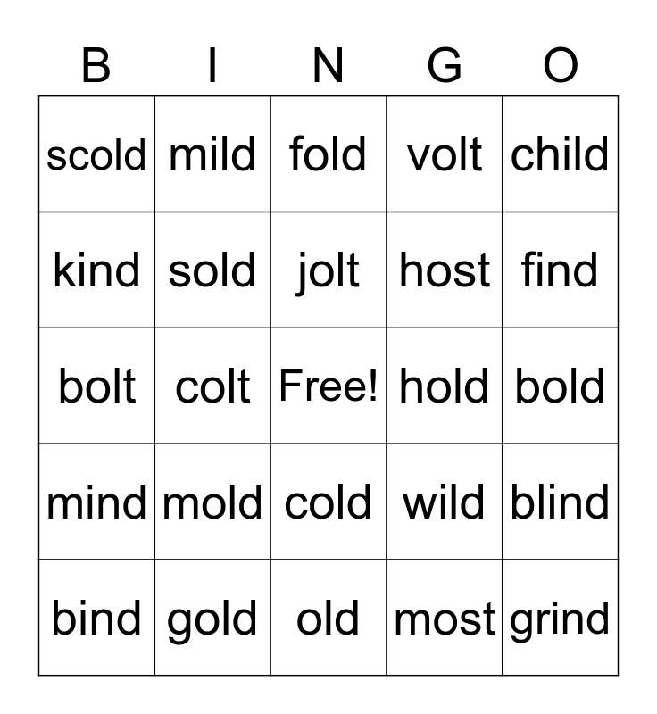 This bingo card has a free space and 26 words: cold, most, jolt, gold, child, scold, kind, mild, bold, wild, host, bolt, blind, bind, colt, post, volt, mind, fold, grind, find, old, hold, mold, sold and wild.