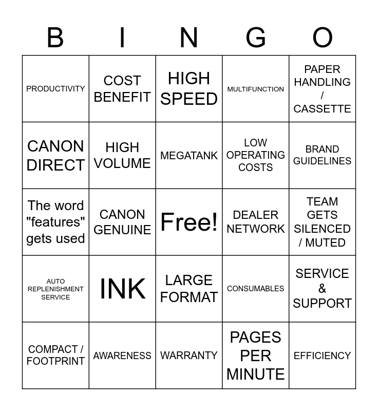 This bingo card has a free space and 24 words: INK, AWARENESS, MEGATANK, COMPACT / FOOTPRINT, PAPER HANDLING / CASSETTE, PRODUCTIVITY, CANON DIRECT, COST BENEFIT, DEALER NETWORK, LARGE FORMAT, LOW OPERATING COSTS, The word "features" gets used, CONSUMABLES, SERVICE & SUPPORT, HIGH VOLUME, PAGES PER MINUTE, TEAM GETS SILENCED / MUTED, HIGH SPEED, BRAND GUIDELINES, CANON GENUINE, EFFICIENCY, AUTO REPLENISHMENT SERVICE, MULTIFUNCTION and WARRANTY.