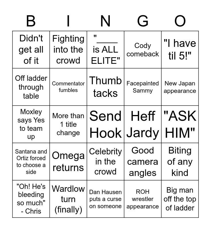 This bingo card has a free space and 29 words: "Oh! He's bleeding so much" - Chris, Look at the Power, More than 1 title change, Bad Botch, Didn't get all of it, "____ is ALL ELITE", Commentator fumbles, Omega returns, Heff Jardy, Wardlow turn (finally), "ASK HIM", Big man off the top of ladder, Dan Hausen puts a curse on someone, ROH wrestler appearance, New Japan appearance, Tony Khan, Celebrity in the crowd, Santana and Ortiz forced to choose a side, "I have til 5!", Moxley says Yes to team up, Good camera angles, Hayter betrays DMD, Facepainted Sammy, Off ladder through table, Cody comeback, Fighting into the crowd, Biting of any kind, Thumb tacks and Unexpected tag team breakup.