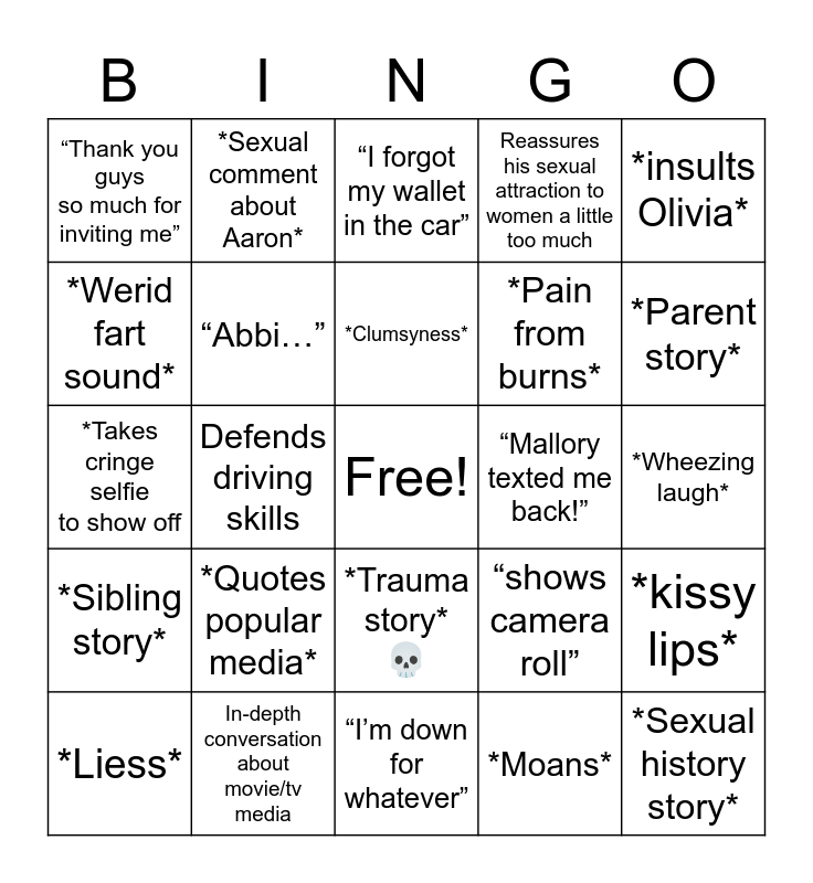 This bingo card has a free space and 24 words: *Quotes popular media*, In-depth conversation about movie/tv media, *Clumsyness*, *Liess*, *insults Olivia*, “Thank you guys so much for inviting me”, *Werid fart sound*, *Sexual comment about Aaron*, “Mallory texted me back!”, *Trauma story* 💀, *Pain from burns*, *Takes cringe selfie to show off, “shows camera roll”, *kissy lips*, “Abbi…”, *Moans*, *Wheezing laugh*, “I forgot my wallet in the car”, *Parent story*, Defends driving skills, *Sexual history story*, *Sibling story*, Reassures his sexual attraction to women a little too much and “I’m down for whatever”.