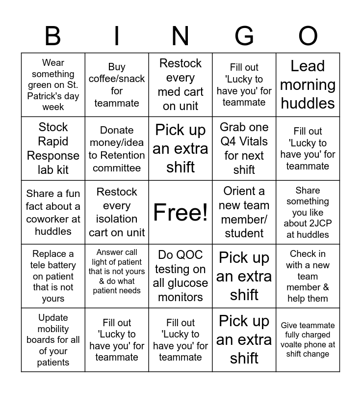 This bingo card has a free space and 24 words: Answer call light of patient that is not yours & do what patient needs, Fill out 'Lucky to have you' for teammate, Pick up an extra shift, Update mobility boards for all of your patients, Lead morning huddles, Wear something green on St. Patrick's day week, Stock Rapid Response lab kit, Buy coffee/snack for teammate, Orient a new team member/ student, Do QOC testing on all glucose monitors, Grab one Q4 Vitals for next shift, Share a fun fact about a coworker at huddles, Pick up an extra shift, Check in with a new team member & help them, Donate money/idea to Retention committee, Pick up an extra shift, Share something you like about 2JCP at huddles, Restock every med cart on unit, Fill out 'Lucky to have you' for teammate, Restock every isolation cart on unit, Give teammate fully charged voalte phone at shift change, Replace a tele battery on patient that is not yours, Fill out 'Lucky to have you' for teammate and Fill out 'Lucky to have you' for teammate.