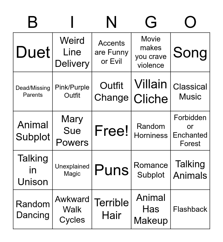 This bingo card has a free space and 24 words: Unexplained Magic, Awkward Walk Cycles, Outfit Change, Random Dancing, Song, Duet, Dead/Missing Parents, Weird Line Delivery, Random Horniness, Puns, Villain Cliche, Animal Subplot, Romance Subplot, Talking Animals, Pink/Purple Outfit, Animal Has Makeup, Forbidden or Enchanted Forest, Accents are Funny or Evil, Classical Music, Mary Sue Powers, Flashback, Talking in Unison, Movie makes you crave violence and Terrible Hair.