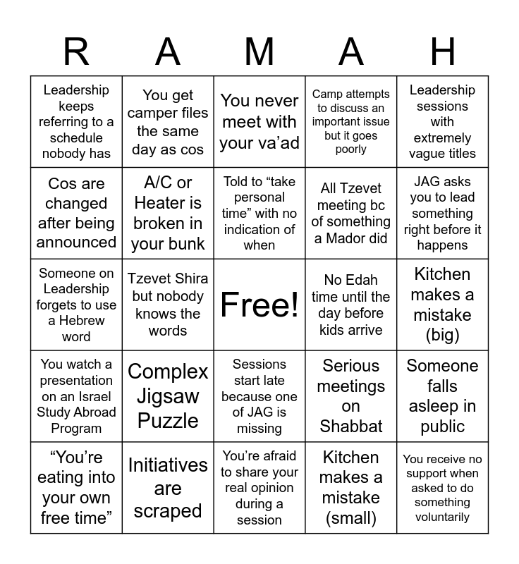 This bingo card has a free space and 24 words: Complex Jigsaw Puzzle, Initiatives are scraped, Told to “take personal time” with no indication of when, “You’re eating into your own free time”, Leadership sessions with extremely vague titles, Leadership keeps referring to a schedule nobody has, Cos are changed after being announced, You get camper files the same day as cos, No Edah time until the day before kids arrive, Sessions start late because one of JAG is missing, All Tzevet meeting bc of something a Mador did, Someone on Leadership forgets to use a Hebrew word, Serious meetings on Shabbat, Someone falls asleep in public, A/C or Heater is broken in your bunk, Kitchen makes a mistake (small), Kitchen makes a mistake (big), You never meet with your va’ad, JAG asks you to lead something right before it happens, Tzevet Shira but nobody knows the words, You receive no support when asked to do something voluntarily, You watch a presentation on an Israel Study Abroad Program, Camp attempts to discuss an important issue but it goes poorly and You’re afraid to share your real opinion during a session.