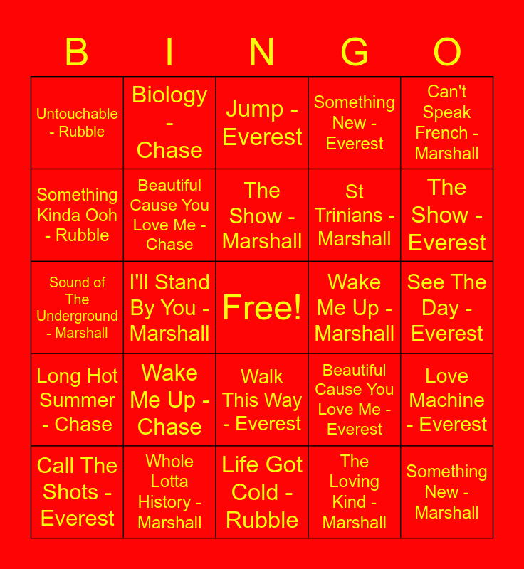 This bingo card has a free space and 120 words: Long Hot Summer - Everest, Love Machine - Rubble, See The Day - Chase, Sound of The Underground - Skye, The Loving Kind - Skye, Untouchable - Skye, Something New - Everest, Love Machine - Chase, Love Machine - Everest, Call The Shots - Skye, Whole Lotta History - Everest, Sexy! No No No... - Marshall, No Good Advice - Skye, I Think We're Alone Now - Skye, Long Hot Summer - Skye, Beautiful Cause You Love Me - Rubble, Walk This Way - Everest, Sexy! No No No... - Skye, No Good Advice - Rubble, Walk This Way - Chase, Call The Shots - Everest, Jump - Everest, Wake Me Up - Everest, Can't Speak French - Chase, Love Machine - Skye, Long Hot Summer - Chase, Whole Lotta History - Marshall, I Think We're Alone Now - Rubble, Whole Lotta History - Skye, I Think We're Alone Now - Marshall, The Loving Kind - Marshall, I'll Stand By You - Marshall, The Show - Marshall, Biology - Skye, I'll Stand By You - Rubble, The Loving Kind - Rubble, Something Kinda Ooh - Skye, Something New - Skye, The Show - Chase, Walk This Way - Rubble, I'll Stand By You - Skye, Long Hot Summer - Rubble, Sound of The Underground - Chase, Can't Speak French - Rubble, Can't Speak French - Everest, Life Got Cold - Marshall, Wake Me Up - Rubble, Wake Me Up - Marshall, See The Day - Rubble, I Think We're Alone Now - Everest, Life Got Cold - Skye, See The Day - Marshall, Beautiful Cause You Love Me - Everest, The Loving Kind - Chase, Untouchable - Marshall, I'll Stand By You - Everest, I'll Stand By You - Chase, Something Kinda Ooh - Chase, St Trinians - Rubble, Biology - Chase, No Good Advice - Marshall, Call The Shots - Chase, St Trinians - Skye, Jump - Chase, No Good Advice - Chase, Something Kinda Ooh - Rubble, The Promise - Skye, Biology - Everest, The Show - Skye, Whole Lotta History - Chase, Sound of The Underground - Marshall, The Loving Kind - Everest, Something New - Rubble, Call The Shots - Marshall, Biology - Rubble, Jump - Skye, St Trinians - Marshall, Jump - Rubble, Something New - Marshall, Wake Me Up - Chase, Untouchable - Rubble, Long Hot Summer - Marshall, St Trinians - Chase, Walk This Way - Marshall, Life Got Cold - Everest, Call The Shots - Rubble, Life Got Cold - Rubble, Sound of The Underground - Everest, The Promise - Marshall, See The Day - Skye, The Promise - Everest, See The Day - Everest, Beautiful Cause You Love Me - Marshall, The Promise - Rubble, Jump - Marshall, Sexy! No No No... - Rubble, Love Machine - Marshall, Can't Speak French - Marshall, Can't Speak French - Skye, Beautiful Cause You Love Me - Skye, St Trinians - Everest, The Show - Rubble, Sexy! No No No... - Chase, Untouchable - Chase, Walk This Way - Skye, Beautiful Cause You Love Me - Chase, Whole Lotta History - Rubble, Untouchable - Everest, Wake Me Up - Skye, I Think We're Alone Now - Chase, Sexy! No No No... - Everest, Something Kinda Ooh - Marshall, The Promise - Chase, Sound of The Underground - Rubble, The Show - Everest, No Good Advice - Everest, Something New - Chase, Biology - Marshall, Life Got Cold - Chase and Something Kinda Ooh - Everest.