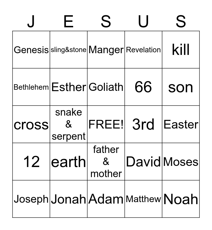 This bingo card has a free space and 24 words: earth, Jonah, Goliath, Joseph, kill, Genesis, Bethlehem, sling&stone, 3rd, father & mother, 66, cross, David, Moses, Esther, Matthew, Easter, Manger, son, snake & serpent, Noah, 12, Revelation and Adam.