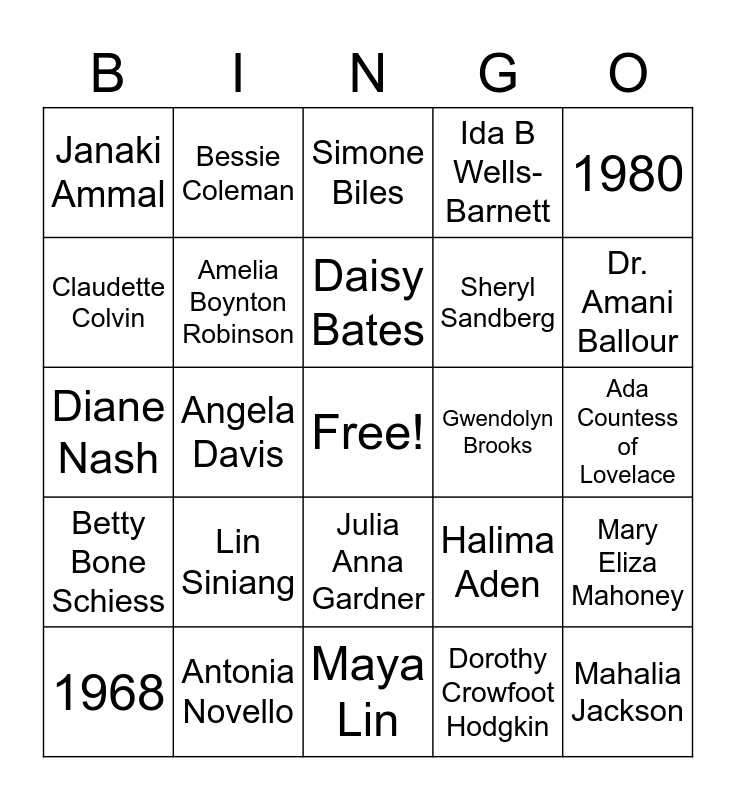 This bingo card has a free space and 75 words: Malala Yousafzai, Junko Tabei, Simone Biles, Ava DuVernay, Sherly Swoopes, Sonia Sotomayer, Madeleine Albright, Dr. Mae C. Jemison, Greta Thunberg, 1978, Ellen Johnson Sirleaf, Ella Baker, Daisy Bates, Claudette Colvin, Dorothy Cotton, Angela Davis, Prathia Hall, Mahalia Jackson, Coretta Scott King, 1980, Clara Luper, Diane Nash, Amelia Boynton Robinson, Bessie Coleman, Ida B Wells-Barnett, Katherine Johnson, 1973, Dorothy Vaughan, Mary Jackson, Octavia Butler, Jacinda Ardern, Serena Williams, Megan Rapinoe, Halima Aden, Dr. Amani Ballour, Sheryl Sandberg, 1972, Amanda Gorman, Ada Countess of Lovelace, Dorothy Crowfoot Hodgkin, Vera Ruben, Dasia Taylor, Margaret Hamilton, Lisa Meitner, Hertha Sponer, Susan Anderson, 1968, Janaki Ammal, Katsuko Saruhashi, Billie Jean King, Sarah Stewart, Julia Anna Gardner, Suzanne Simard, Lexi Phillips, 1971, Alice Ball, Rosalind Franklin, Eunice Foote, Bibha Chowdhuri, Alice Freeman Palmer, Lin Siniang, Neerja Bhanot, 1994, Vigdis Finnbogadottir, Pearl S Buck, Gwendolyn Brooks, Jane Fonda, Sylvia Earle, Sarah Deer, Mary Eliza Mahoney, Betty Bone Schiess, Antonia Novello, Philippa Marrack, Maya Lin and Mary Ann Shadd.
