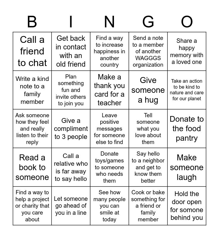 This bingo card has 25 words: Call a relative who is far away to say hello, See how many people you can smile at today, Make a thank you card for a teacher, Find a way to help a project or charity that you care about, Share a happy memory with a loved one, Call a friend to chat, Write a kind note to a family member, Get back in contact with an old friend, Tell someone what you love about them, Donate toys/games to someone who needs them, Give someone a hug, Ask someone how they feel and really listen to their reply, Say hello to a neighbor and get to know them better, Make someone laugh, Plan something fun and invite others to join you, Hold the door open for somone behind you, Donate to the food pantry, Find a way to increase happiness in another country, Take an action to be kind to nature and care for our planet, Give a compliment to 3 people, Leave positive messages for someone else to find, Let someone go ahead of you in a line, Read a book to someone, Send a note to a member of another WAGGGS organization and Cook or bake something for a friend or family member.